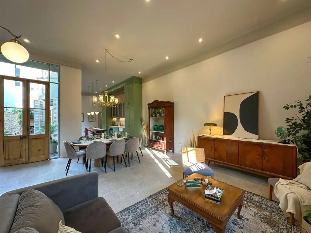 Excelente propiedad manteniendo un mix entre nuevo y antiguo, aberturas de estilo en maderas recicladas, pisos de granito pulido y madera, diseño exclusivos de mobiliario de cocina y baños. Pre instalación para aire acondicionado y radiadores. Desarrollada en dos plantas, con patio, parrillero, terraza, solarium y pileta. Ingreso: Hall de entrada, gran living comedor, can salida por puerta de estilo al patio y ventana al frente, cocina comedor, con isla, mobiliarios bajo mesada y alacenas, de diseño, anafe, horno, caldera individual. Baño toilette de recepción. Salida a patio por puerta de estilo. Acceso a dormitorio principal con baño en suite (completo con mampara de vidrio y espejos) y placares con interiores. amplio dormitorio con ventilación al patio. Galería cubierta, Patio amplio con parrillero, espacio de bacha y baulera.