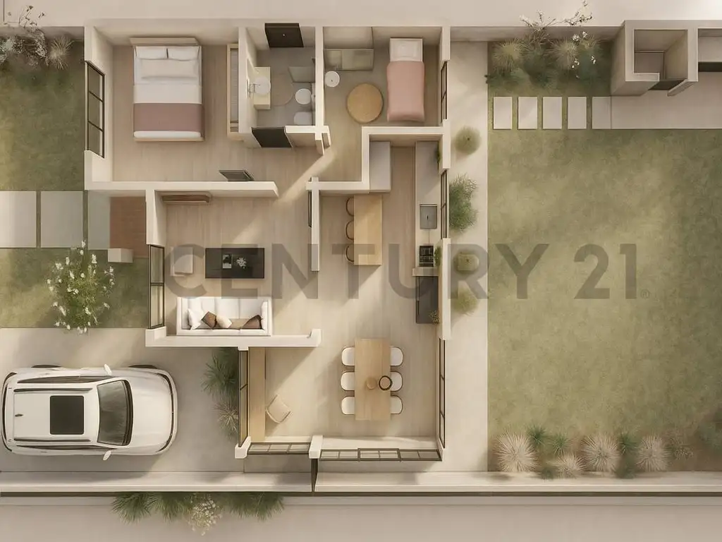 El espacio exterior ofrece un patio con verde ideal para disfrutar en familia o con amigos, y una cochera de cómodo acceso.