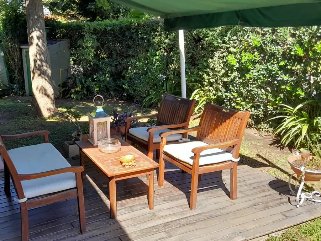 En Exterior: Quincho con cerramientos plegable, aire acondicionado f/c, mesada con bacha, parrilla y horno a gas.