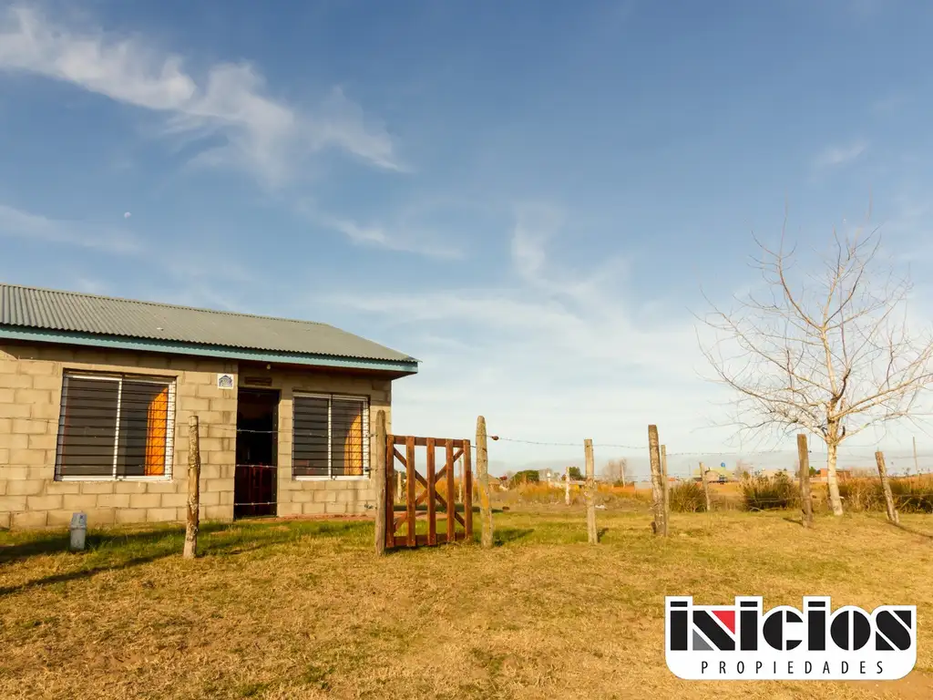 Ubicada en un entorno abierto y natural, esta casa se encuentra construida sobre un amplio terreno de 660 m² (16,5 x 40 m) totalmente cercado, que ofrece múltiples posibilidades de uso. Con una fachada simple y funcional, la propiedad cuenta con ambientes cómodos y bien distribuidos. La vivienda se desarrolla en una sola planta. Al ingresar, encontramos un comedor con buena luz natural, conectado a una cocina práctica, ideal para el día a día. Dispone de dos dormitorios con ventilación natural, pisos cerámicos y techos de madera, lo que aporta calidez y rusticidad al ambiente. El baño está completo y revestido. En el fondo del lote hay una construcción adicional tipo galpón/depósito con tanque elevado, que amplía las opciones de uso del terreno. Una propiedad sencilla pero muy funcional, lista para habitar o adaptar a tus necesidades. Perfecta como casa de fin de semana, vivienda permanente o inversión a futuro, en una zona que sigue en crecimiento