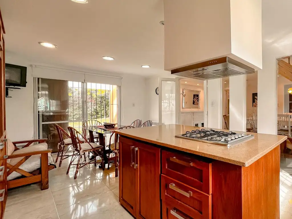 - Cocina comedor con barra desayunadora, equipada con anafe y horno; vistas al frente y al parque, pisos en porcelanato.