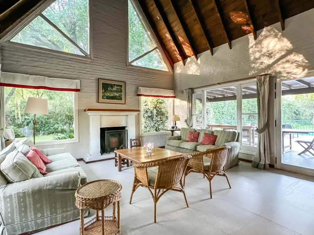 Luminoso living con chimenea y techos de doble altura