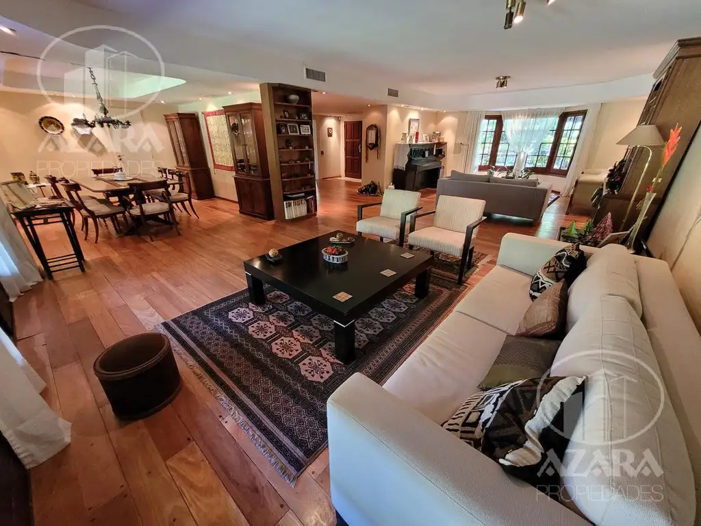 Planta Baja: Garage para 2 autos con portón automatizado. Gran hall de recepción, con sala de recepción y toilette. Living y comedor con vistas al jardín. Cocina comedor con isla tipo barra y comedor diario. Despensa. Lavadero cubierto independiente. Dependencia completa con habitación (hoy se utiliza como sala de planchado) y baño. Galería con techo de madera, quincho con parrilla, bacha y baño, gran jardín con riego por aspersión y piscina de material.