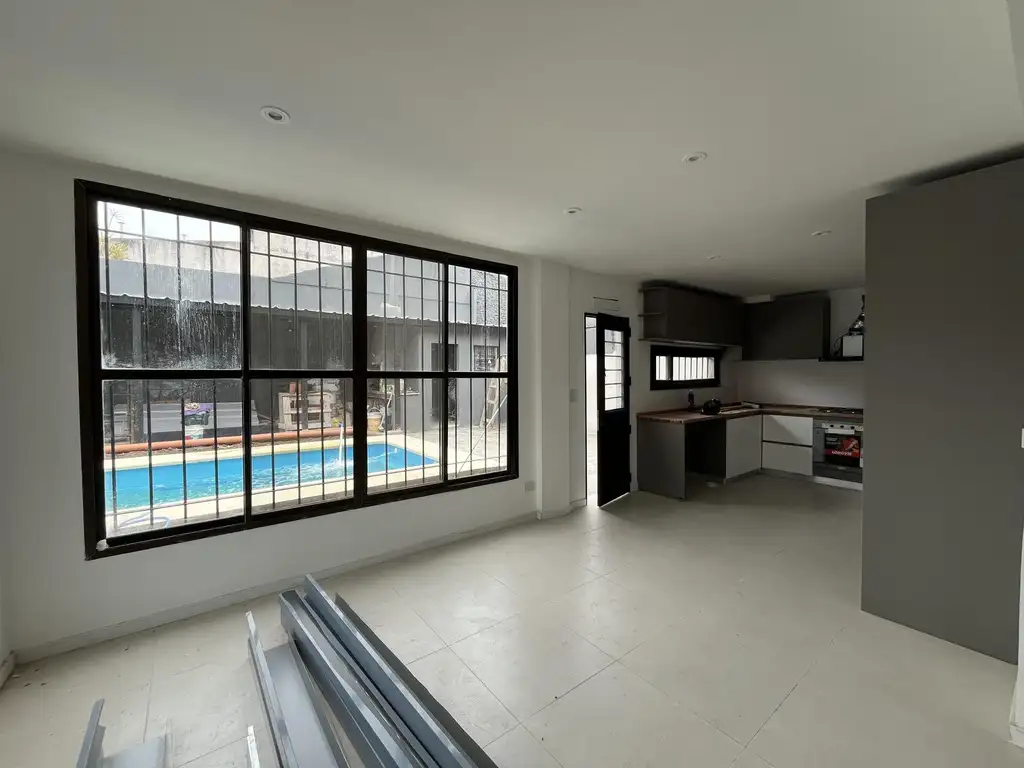 El exterior ofrece un patio, una pileta nueva, y una cochera/quincho con parrilla y cuarto/deposito para varios destinos.