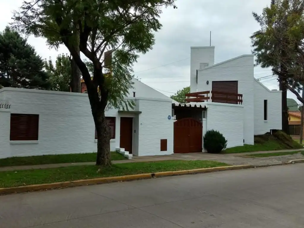 Casa blanca estilo mediterránea en esquina de dos plantas en un lote de 395m2, con 178m2 cubiertos y 217m2 descubiertos. Al ingresar está la sala de estar, luego un living con sillones de mampostería y a un costado el hogar con salamandra, más adelante una arcada con un pasillo de circulación con el que se accede al comedor y por último está la cocina totalmente equipada con heladera, cocina con horno, extractor de aire, microondas y muebles bajo mesada y alacenas, además de un portero eléctrico para saber quien toca la puerta. De la cocina, al igual que del living y la sala de estar se puede salir a un gran patio. Luego está el garage amplio para tres autos, que también se puede usar de quincho, ya que cuenta con parrilla y horno de barro. A continuación está el lavadero. Por último, hay un pequeño departamento de dos ambientes: dormitorio, living cocina y baño, que da tanto a la parte trasera como al frente de la casa, ya que la propiedad hace esquina. Desde el hall, mediante una escalera se accede a la planta alta, donde están los dos dormitorios, uno con una gran terraza y un baño segmentado completo.