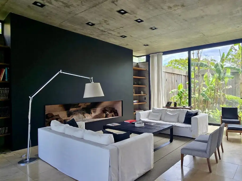 Te prestamos esta increíble casa de estilo racionalista diseñada en una sola planta en forma de L con detalles de hormigón y madera de mucha calidad constructiva, implantada en un lote de 1200m2 en el exclusivo barrio El Golf Nordelta.