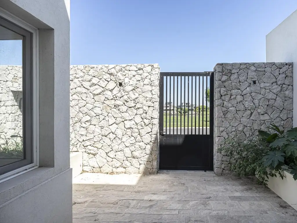 Galería con parrilla. Jardín con césped escalonado hacia el lago.Pileta. Cochera para dos autos sin techar.