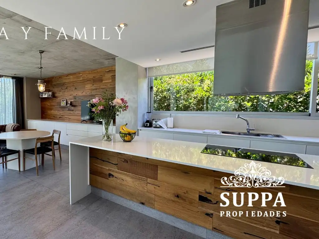 Ingresando en la Planta Baja encontramos un amplio hall de recepción, hacia la derecha nos dirigimos a la cocina (MI COCINA) con gran isla y family. La misma cuenta con artefactos de calidad marca Ariston: horno eléctrico, anafe vitrocerámico, lavavajillas y microondas. Gran área de servicio con lavadero, dependencia y dormitorio de huéspedes en suite.
