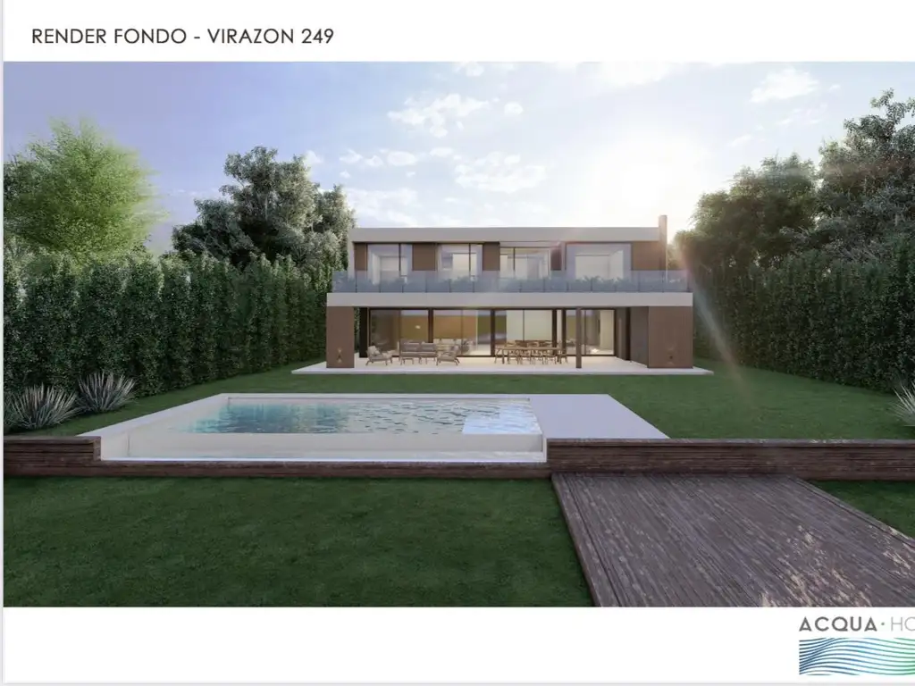 - Pileta revestida en piedra bali verde con desborde infinito al lago. Solarium en travertilit gris claro.