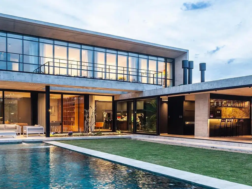 La casa fue diseñada, por OON Architecture. Construida por Robra. Moderna, funcional y lista para disfrutar. Hormigón visto, revestimiento en aluminio negro. Fachada revestida en piedra. Cercana al ingreso del barrio, sobre una calle amplia. Antes de ingresar a la misma nos encontramos sobre mano derecha y con entrada independiente a la casa, un office, cuarto o sala de ensayó, con baño completo, aire frio/calor. El mismo tiene ventanales al estanque con plantas acuáticas, doble cascada e iluminación sectorizada.