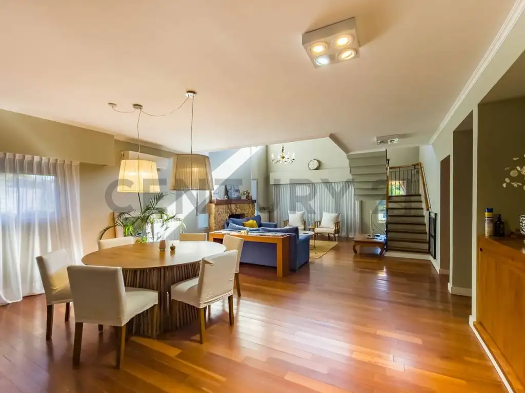 Venta de casa en barrio residencial Hostal del Sol de amplias medidas y excelentes prestaciones, esta propiedad brinda espacios muy amplios y cálidos, ideales para el desarrollo de la vida en familia. Al ingresar a la propiedad accedemos al recibidor que conecta directamente con el garaje doble y con la sala de estar desarrollada en doble altura que tiene ventanales al patio con orientaciones este y oeste haciendo un ambiente muy luminoso, también cuenta con un hermoso hogar que le brinda calidez. Desde la sala de estar podemos acceder al Play Room pensado para que los más pequeños reciban sus amigos y pasen horas jugando. También desde la sala de estar se accede a la cocina comedor que cuenta con una amplia mesada desarrollada en L equipada con bajo mesada y alacenas que brindan mucho espacio de guardado, el área de comedor se desarrolla en la esquina quedando un box. La cocina tiene ventanas hacia el frente y hacia el pasillo lateral descubierto de la propiedad lo que hace que sea un lugar muy luminoso, un paño fijo conecta visualmente la cocina con la sala de estar. Volviendo a la sala y llegando al pasillo intimo accedemos al baño de planta baja que está completo con bañera y a al lavadero donde se encuentran la caldera y el termotanque.
