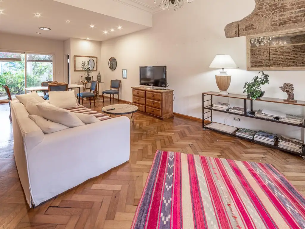-En planta baja se ingresa a un amplio living con pisos de madera, ventanal al frente y salida a un jardín interno con variedad de plantas que aportan calidez y privacidad. En este nivel se encuentran también una cómoda cocina con pasaplatos hacia el comedor diario muy luminoso y con salida al jardín, un dormitorio con vista al frente y dos baños completos.