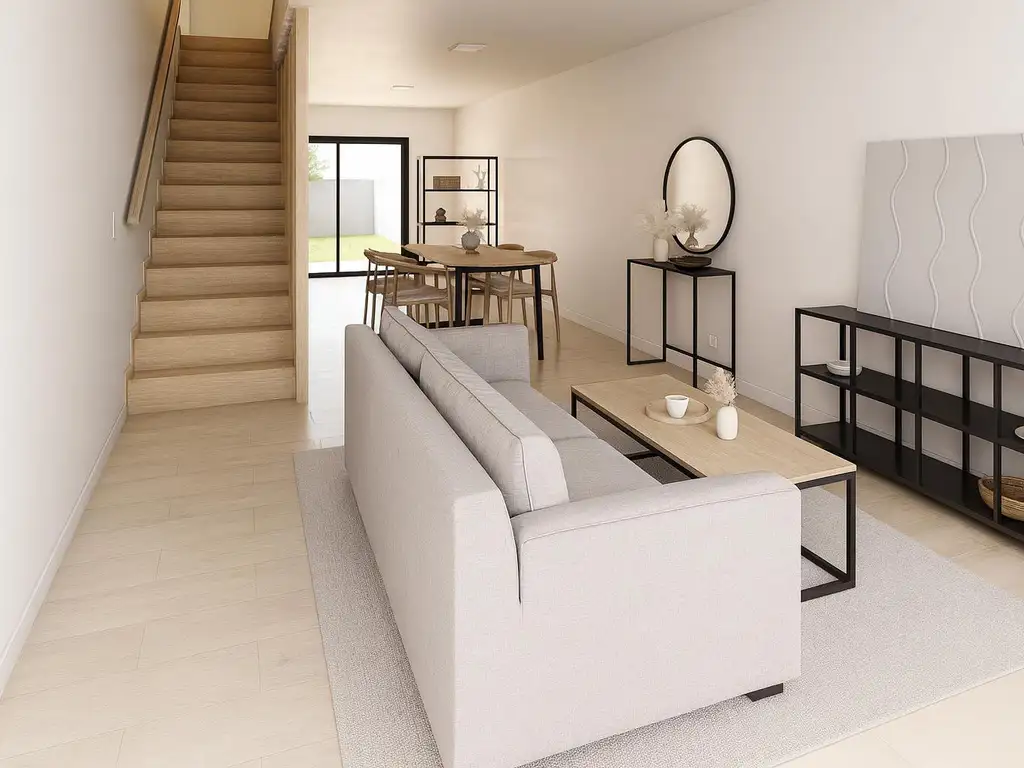 Al ingresar, un luminoso living comedor con pisos de porcelanato símil madera y escalera revestida e iluminada.