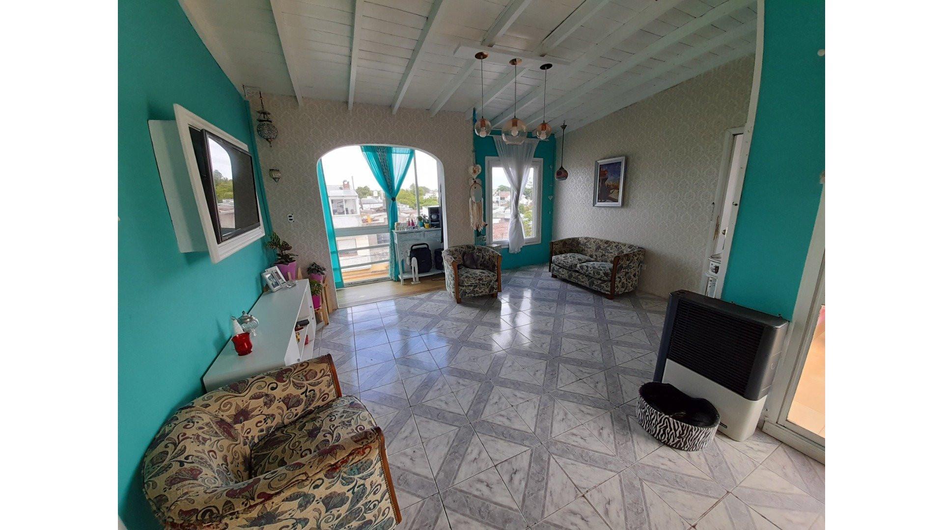 En segundo piso por escalera se encuentra la casa de 3 ambientes, con amplio living comedor con cocina incorporada, patio semicubierto, 2 dormitorios, baño completo, balcón con cerramiento y gge para 1 auto.