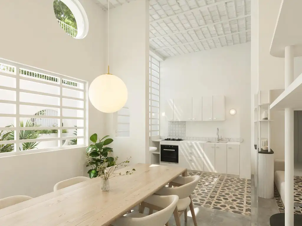 En cuanto a la distribución, en la planta baja, la casa cuenta con una cochera e ingreso de servicio que incluye un lavadero. Por otro lado, se accede al ingreso principal a través de un patio que da hacia una gran abertura, conectando visualmente con el espacio principal de la vivienda. Este espacio principal está compuesto por la cocina, el comedor, el estar y un baño de invitados de amplias dimensiones.