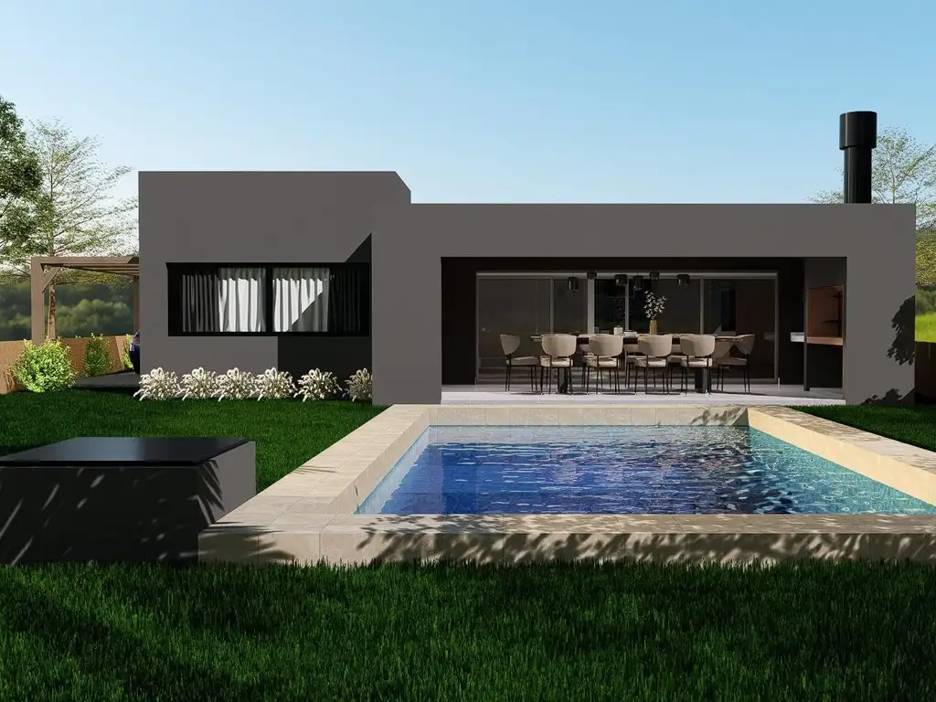 Dos dormitorios con baño compartido, suite principal con amplio vestidor y baño completo con ante baño,Galeria cubierta de 37mts2, parrilla, mesada y bacha.Piscina incluida en los planos de 28 mts2.