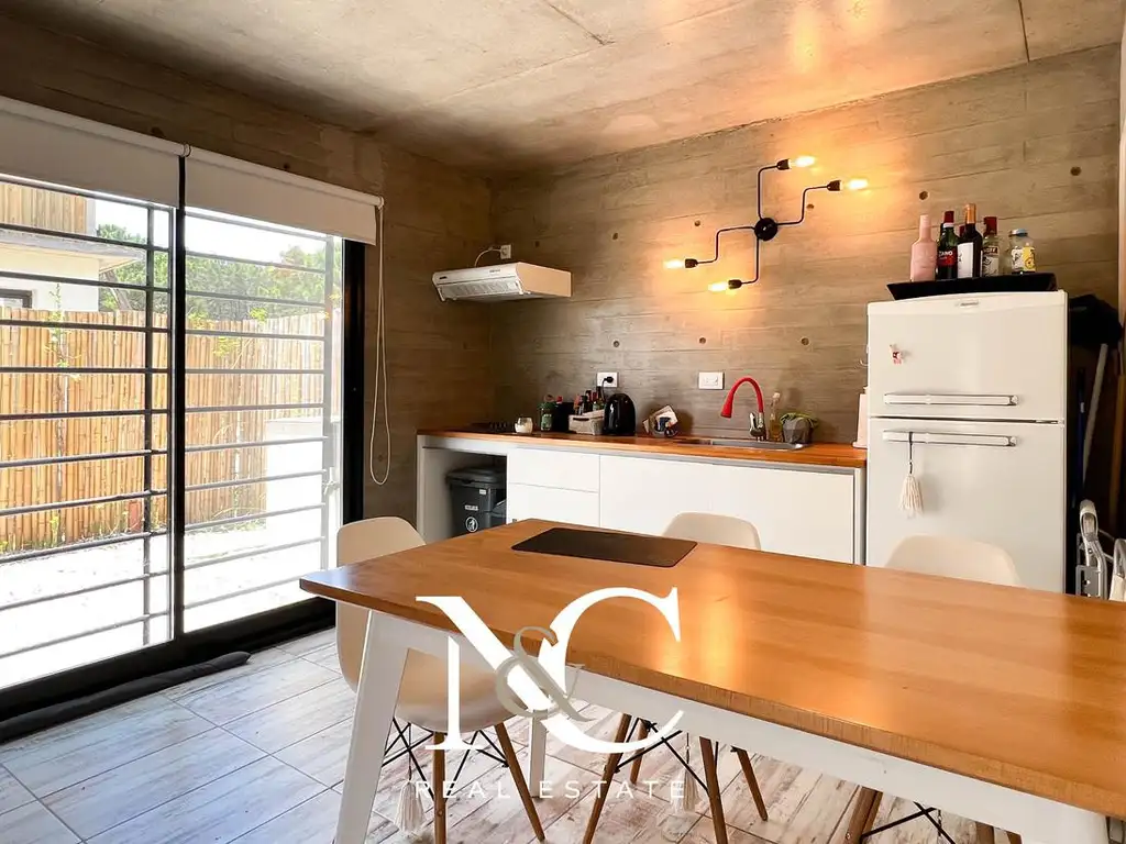Living comedor con cocina integrada, patio con parrilla y espacio guarda coche al frente.