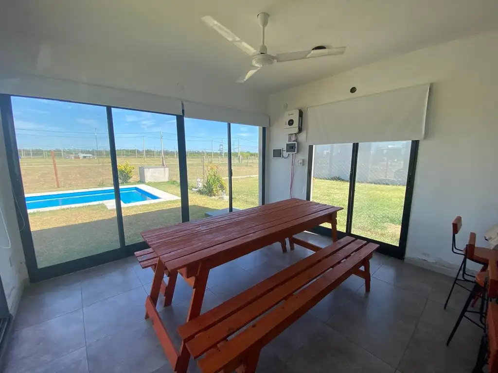 El mismo cuenta con una cochera techada para un vehículo, baño completo, cuarto de guardado, Amplio quincho con mucha luz y salida al parque con vista a la pileta. Aberturas de aluminio DVH.