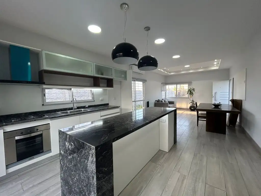 Cocina/comedor integrada con isla de mármol de 2.5m. Con anafe y horno empotrado.