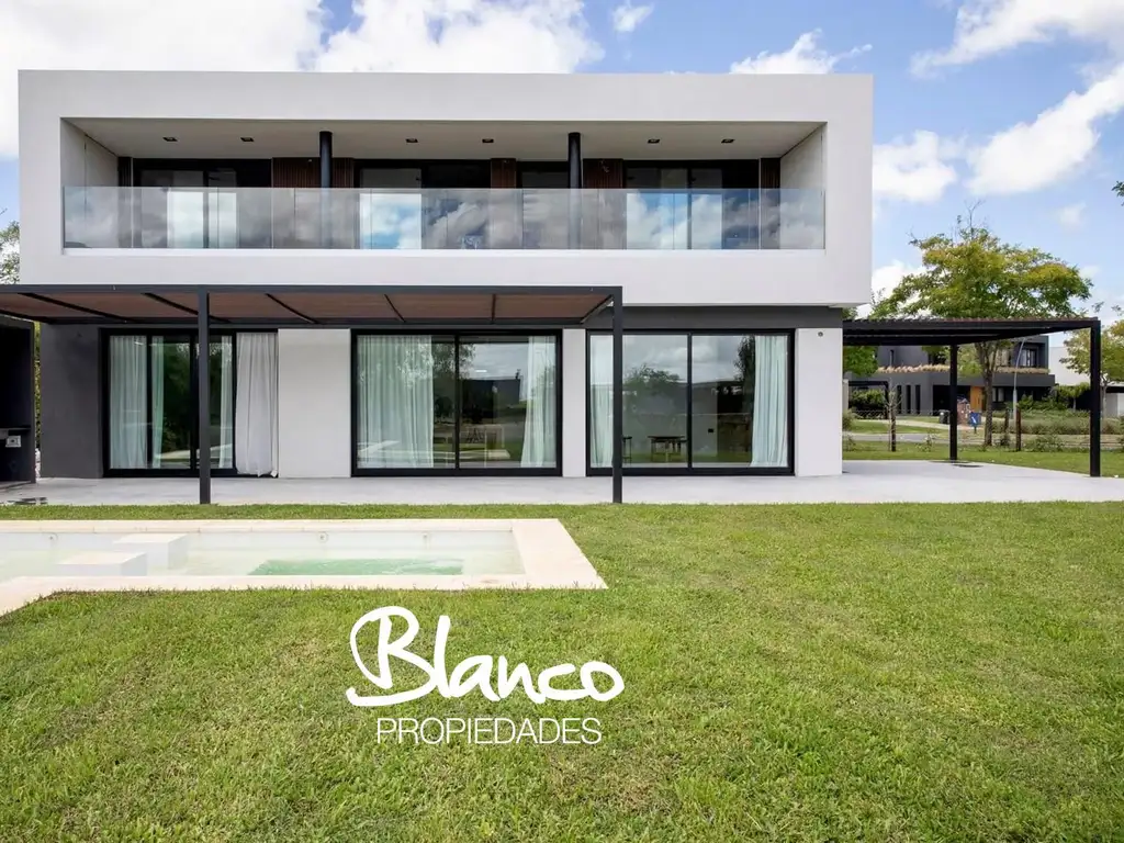 Casa de diseño moderno con grandes ventanales y detalles en piedra, dentro del Barrio Puertos del Lago - Marinas, Escobar.