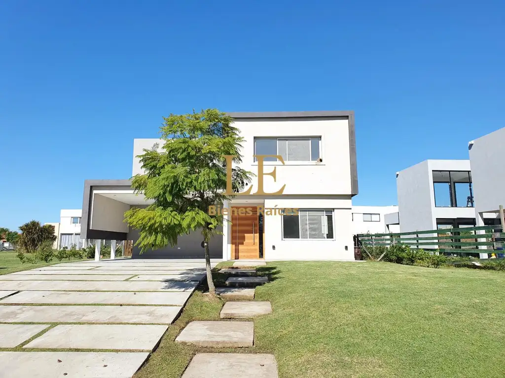 Entrada con galería cubierta para coche y porche, y gran puerta hacia la recepción con sector de guardado, oficina o dormitorio y acceso a planta alta. Living Comedor, Cocina con Isla de concepto abierto e integrado, con salidas a galeria y jardin, dependencia de servicio con año completo. Acceso a la planta alta mediante una escalera, donde se encuentran tres dormitorios; el principal en suite con baño y vestidor, y dos con acceso a terrazas con excelentes vistas, todos con placares de piso a techo de alta calidad. En el exterior, galería, parrilla y piscina iluminada con solarium y cascada. Detalles incluyen calefacción por losa radiante, aberturas de PVC con doble vidriado, preinstalaciones para aire acondicionado, riego por aspersión, puertas macizas de calidad y griferías de primera marca.