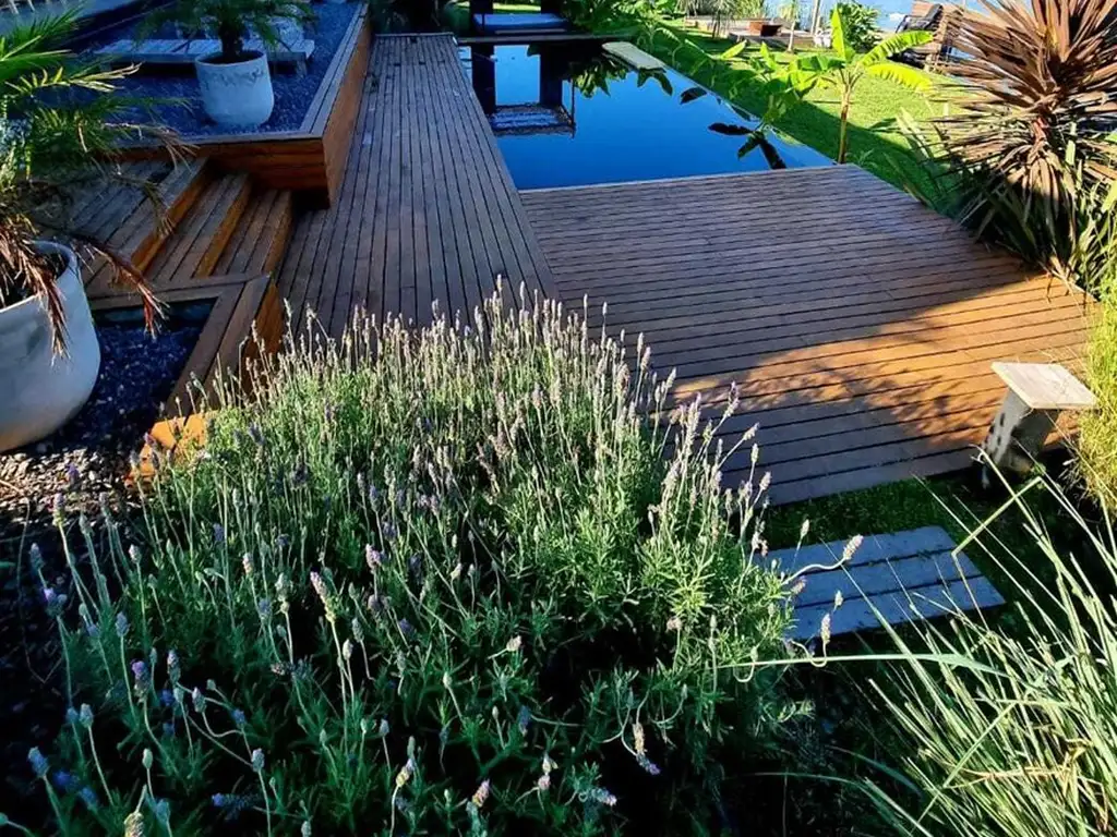 La casa es en 1 planta, con terminaciones de 1ra calidad. Entrada por un puente sobre estanque y plantas, puerta principal pivotante y de diseño único en lapacho. Hall de entrada impactante, de hormigón y terminaciones en Lapacho, vistas directas a la laguna. Living super amplio y moderno, ventanales y completas vistas al exterior, comedor con vistas al jardín, gran lavadero, toilette, cocina industrial y original, vistas a la laguna y reserva ecológica. Gran galeria cubierta de madera,, super calida. Pileta Climatizada, cubierta de venecitas negras. Deck de Lapacho. Camastro, Muelle y deck. Grama Bahiana y paisajismo en todo en jardin