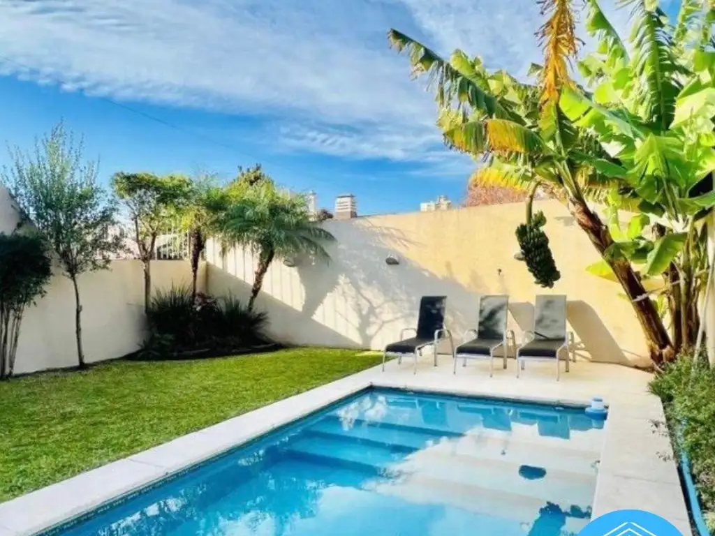 Extenso jardín parquizado con piscina automatizada, espacio solárium, galería, baño toilette, cuarto de guardado, parrilla con bacha y cochera pasante para dos autos.