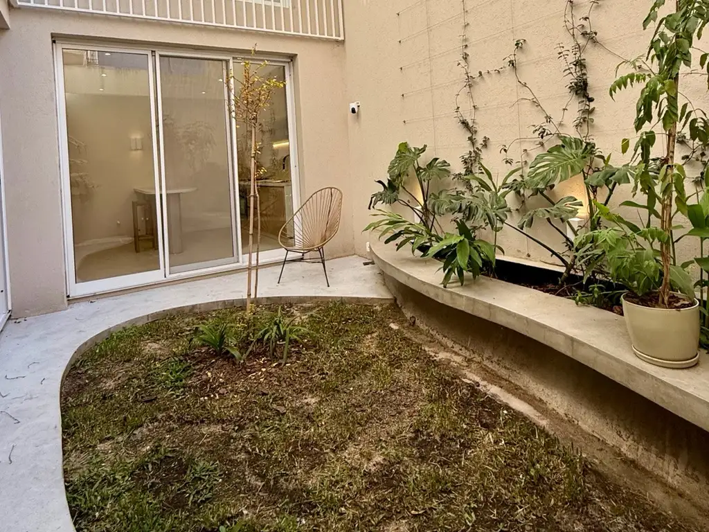 Jardín interno con intervención de paisajismo, canteros con plantas y césped natural.