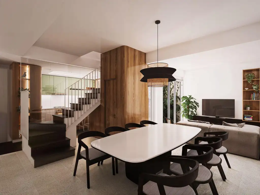 La propuesta integra elementos arquitectónicos tradicionales con soluciones contemporáneas, buscando mantener la esencia de la vivienda original mientras se actualiza su funcionalidad y confort. En la planta baja, la propiedad cuenta con una cocina de amplias dimensiones, un living comedor integrado y un toilette de recepción.