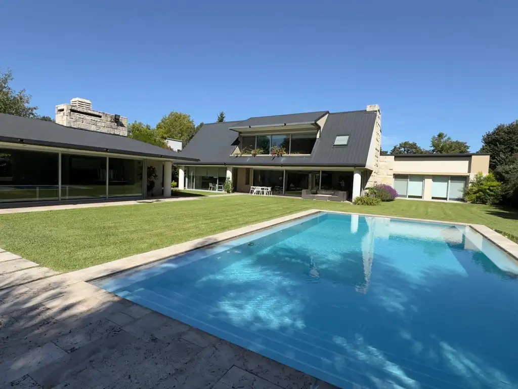 Imponente casa estilo moderno desarrollada en dos plantas con excelente calidad constructiva y vistas al polo. En planta baja se ubica un hall de recepción, toilette, amplio living con salamandra, comedor principal y cocina integrada con isla, todos los ambientes vidriados con salida directa al parque. Dos dormitorios completos en suite con vestidor.
