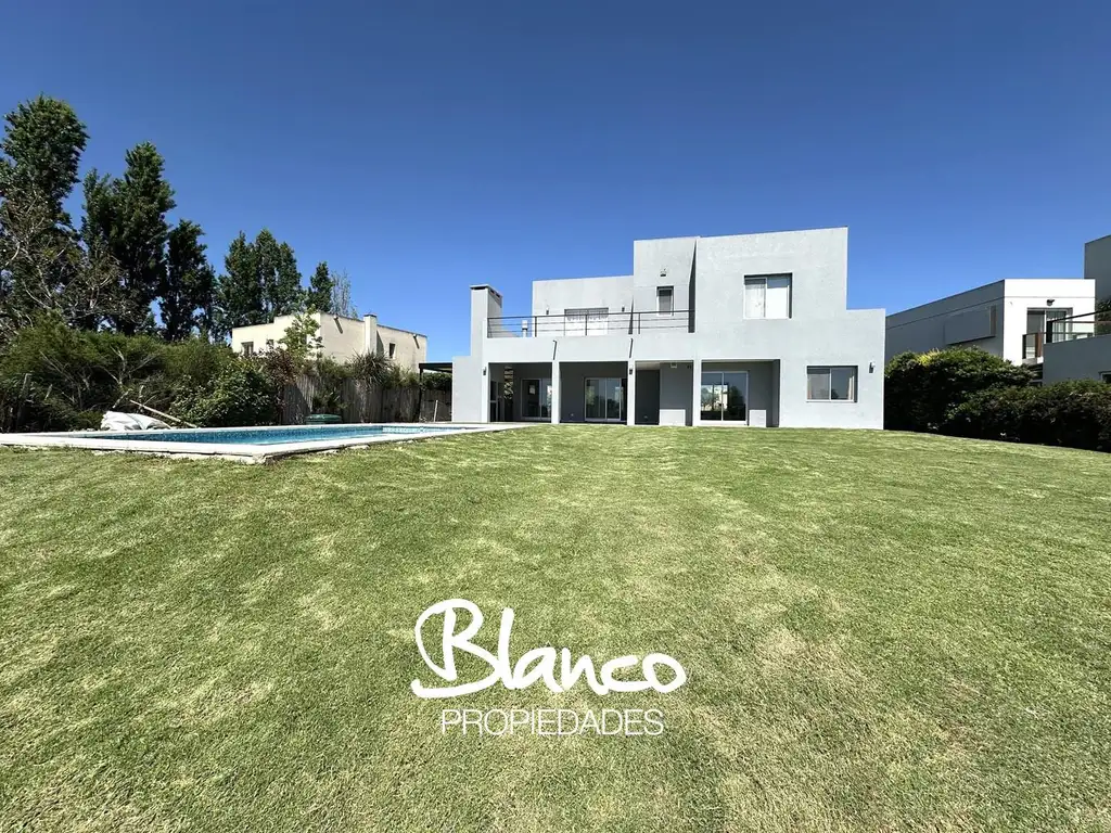 Exterior: Enorme galería con parrilla. Espectacular jardín a laguna con pileta. Estacionamiento semicubierto (2). Descubierto (2).
