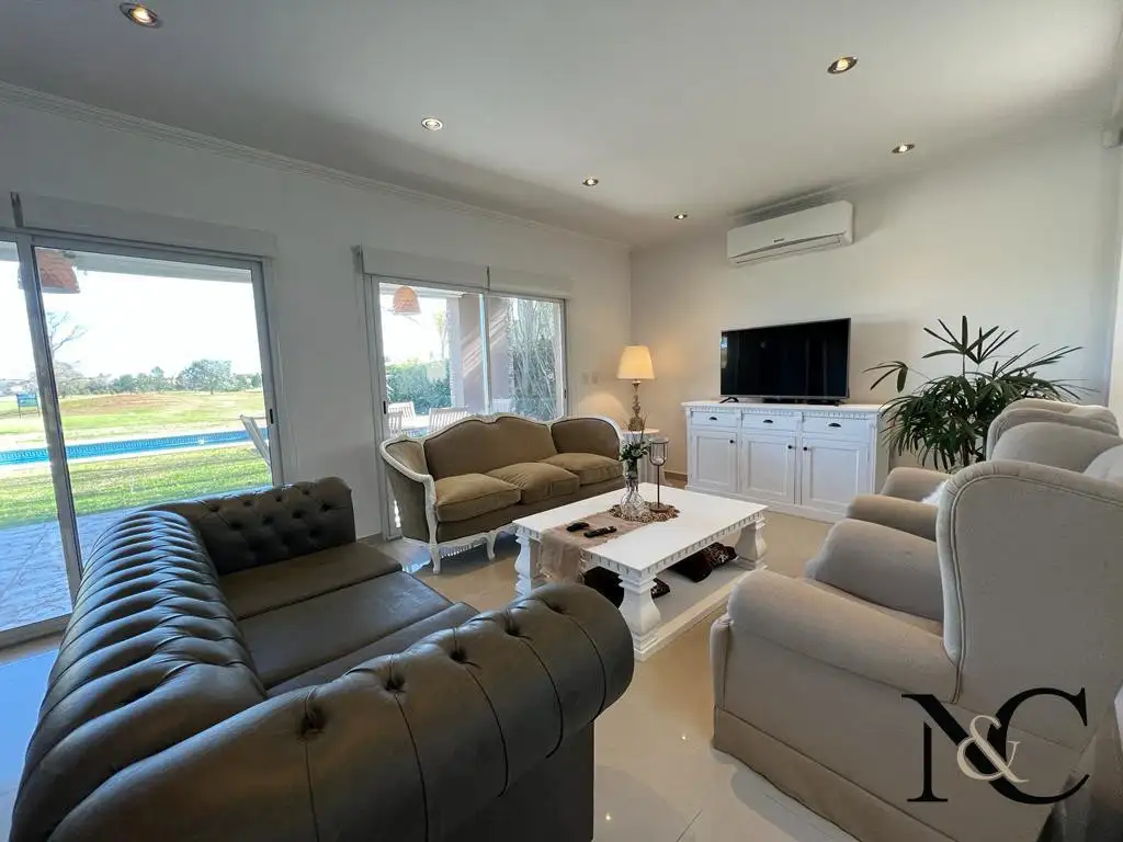 Planta Baja: hall de recepción en doble altura, living comedor con hogar y ventanales al golf, escritorio y toilette de recepción. Cocina completa con comedor diario, lavadero, dependencia de servicio con baño completo, que también tiene entrada para utilizar como baño de pileta. Cochera techada para dos autos.