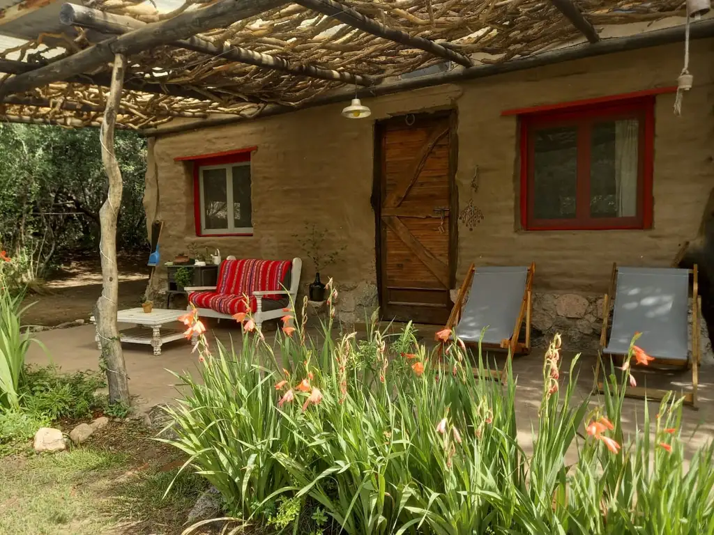 Casa de adobe, estilo serrano, muy fresca, con galería norte y alero al sur;