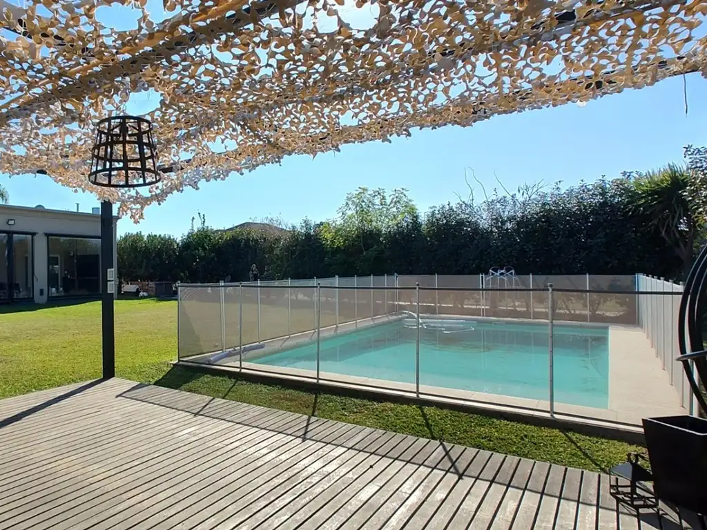 Casa en venta, toda en planta baja, en el barrio cerrado San Matías, Area 2, Escobar, Bs. As. Lote interno, superficie casa total 161m2, lote de 909.55m2, en esquina con fondo al sudeste y jardin con grandes plantas, pileta, fogon, pergola y cochera lateral semicubierta.