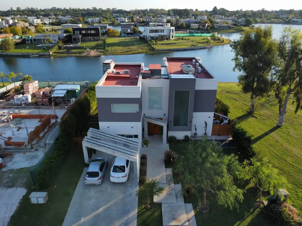 Galería del sector living con importante vista a la laguna y jardín parquizado con mucha privacidad. Baño con ducha.Pérgola con arcadas de hormigón visto con capacidad para 6 vehículos. Pileta de 3x11 m con borde infinito, con playa húmeda y solarium .