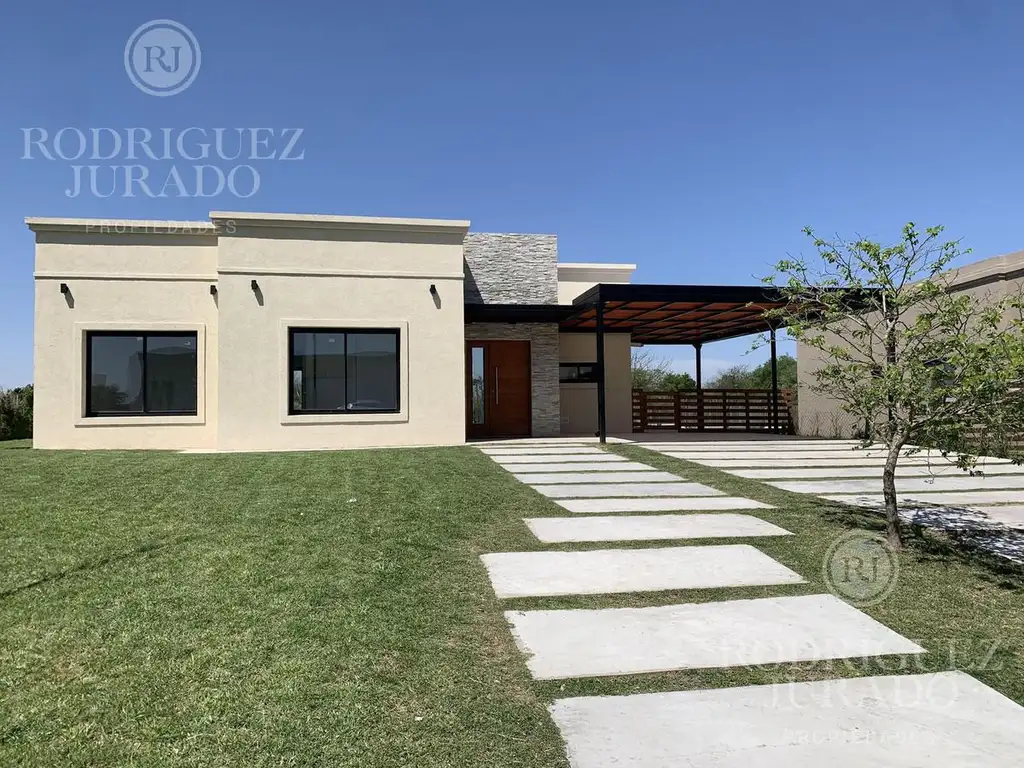 Acceso vehicular y acceso peatonal con hormigón, revestimiento de piedra en volumen de acceso principal, amplio living comedor, cocina integrada, lavadero con acceso de servicio, 3 dormitorios, 2 baños completos, galería cubierta con parrilla, cochera cubierta realizada en hierro incluida, pileta de natación.