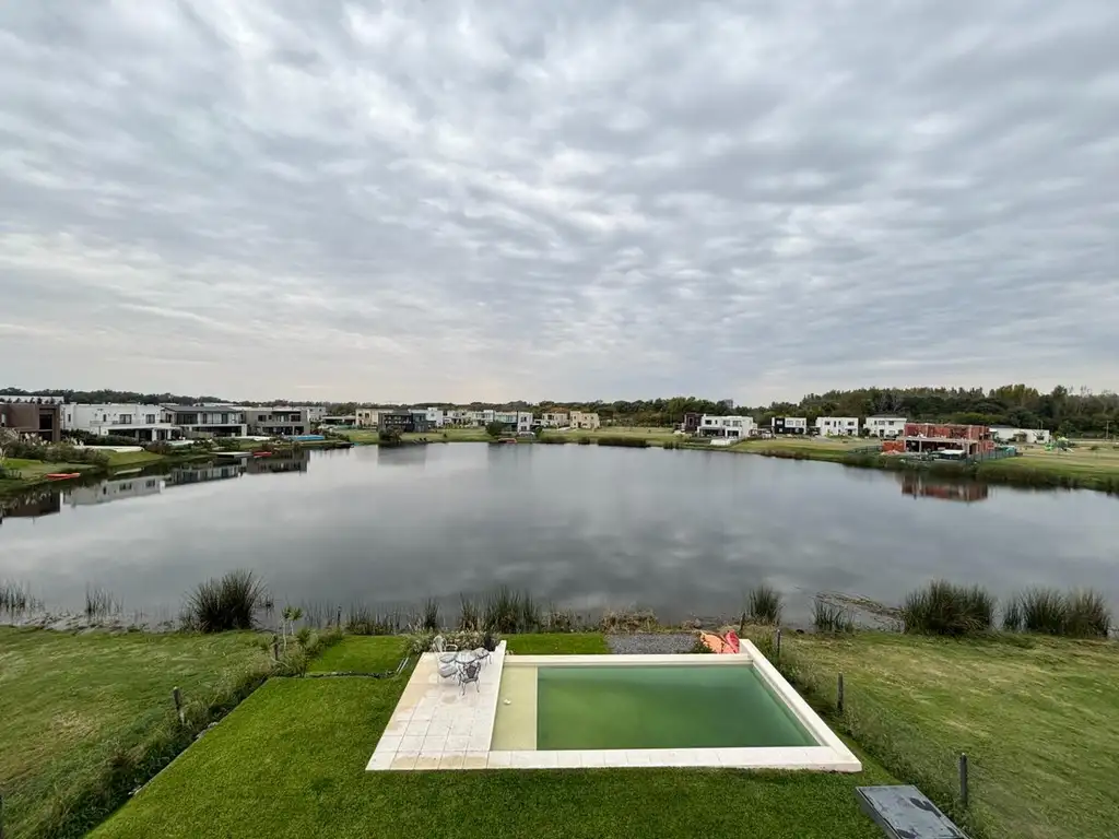 Pileta de 8 x 4 mts. pintada con desborde infinito. Jardín parquizado con riego automático.Bajada hacia la laguna con escalones de madera dura y espacio amplio para fogonero.