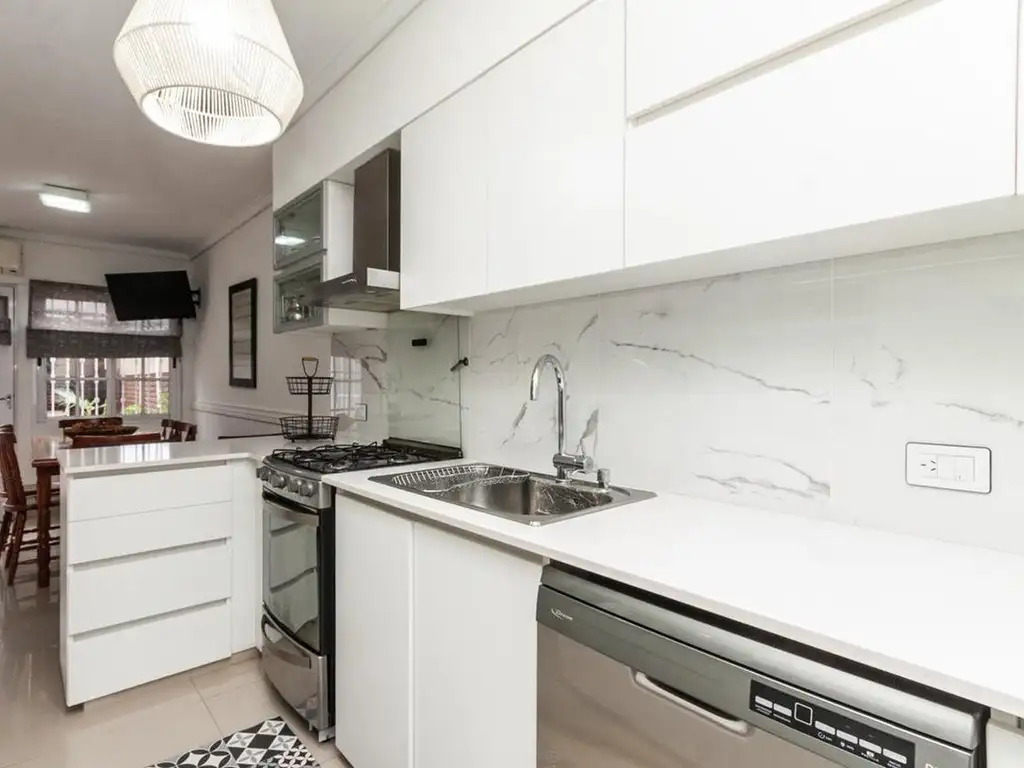 Cocina totalmente renovada con muebles laqueados blancos, mesadas de mármol claro y revestimientos cerámicos tipo mármol.