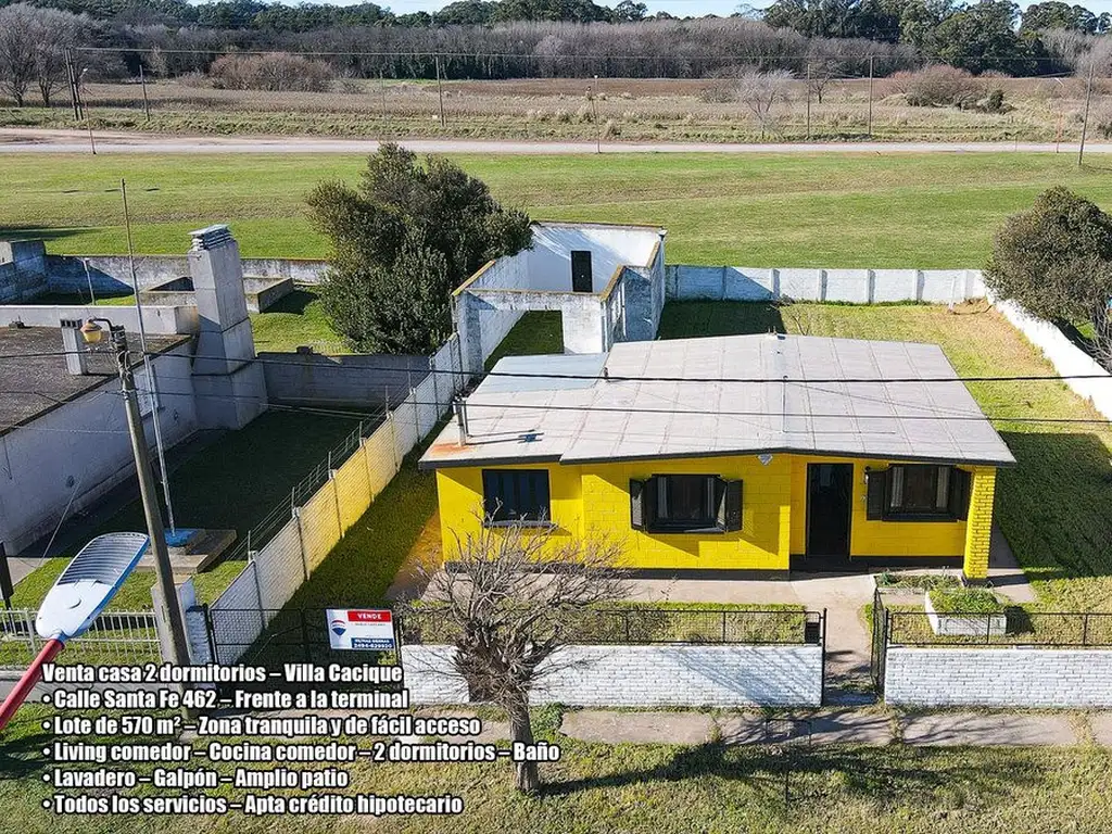 En la localidad de Villa Cacique nos encontramos con esta excelente oportunidad, frente a la terminal y a pasos de la Ruta 80 contamos con esta magnifica casa ubicada en calle Santa Fe al 462.