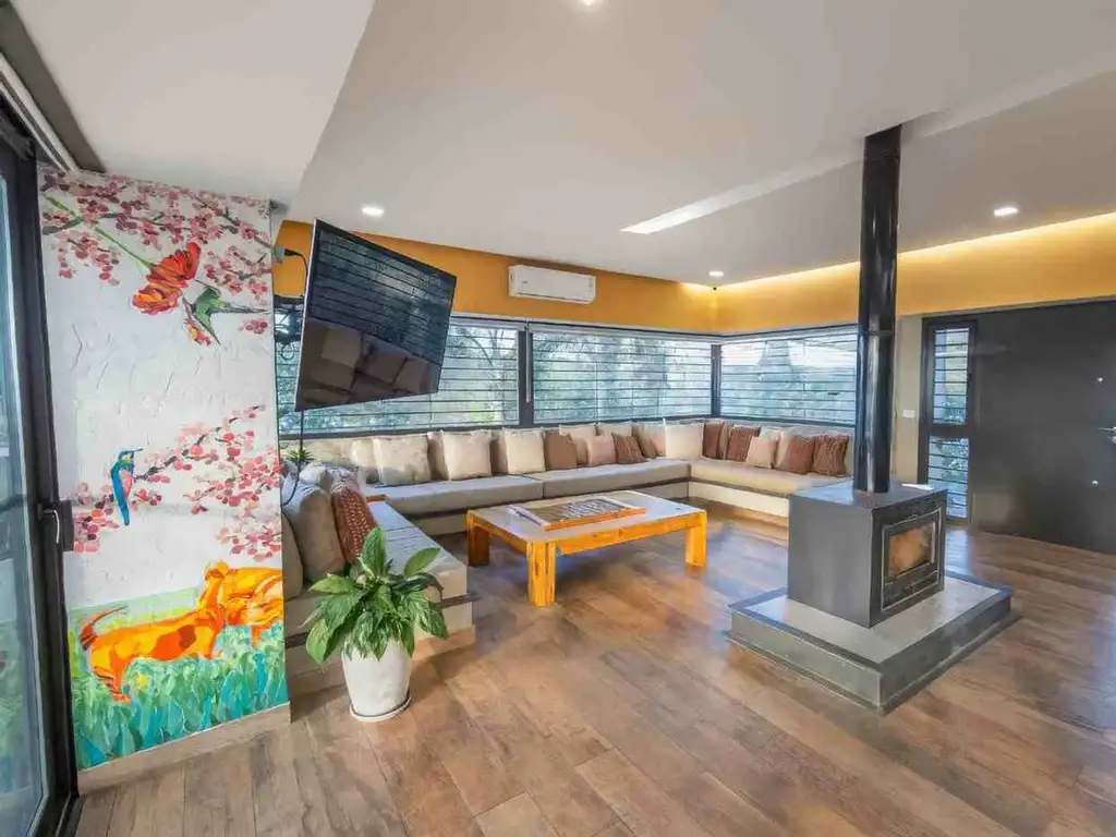 Living de diseño contemporáneo, con hogar a leña y panorámicas de 180°