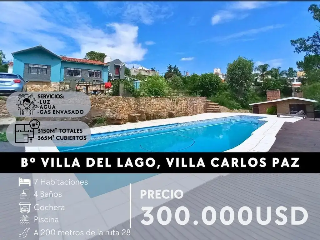 Esta gran propiedad, ubicada a 15 cuadras del centro de Villa Carlos Paz en barrio Villa del Lago, cuenta con espacios amplios, un terreno de gran tamaño con mucho potencial para diferentes desarrollos, hermosas vistas y ubicado a 200m de la Ruta 38, en un entorno de vecinos permanentes y propiedades de gran nivel, sobre calle adoquinada. Además, cuenta con un departamento de dos dormitorios y un altillo o departamento de huéspedes, ambos con entrada independiente de la casa, lo cual lo hace muy potencial para renta temporaria.