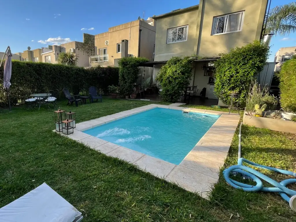 Esta propiedad es apta para crédito y ofrece la conveniencia de 3 cocheras descubiertas. Las expensas ascienden a AR$150.000, asegurando un entorno mantenido y seguro. Entre sus características adicionales, destacan el aire acondicionado, la conexión a internet y teléfono, así como la posibilidad de disfrutar de una piscina, área de juegos infantiles y canchas de fútbol dentro del barrio privado. Además, la casa cuenta con un patio ideal para disfrutar en familia, parrilla, y espacios diseñados para el confort, como un lavadero y un comedor con desayunador. También es un lugar pet-friendly, permitiendo que tus mascotas sean parte de tu nuevo hogar.