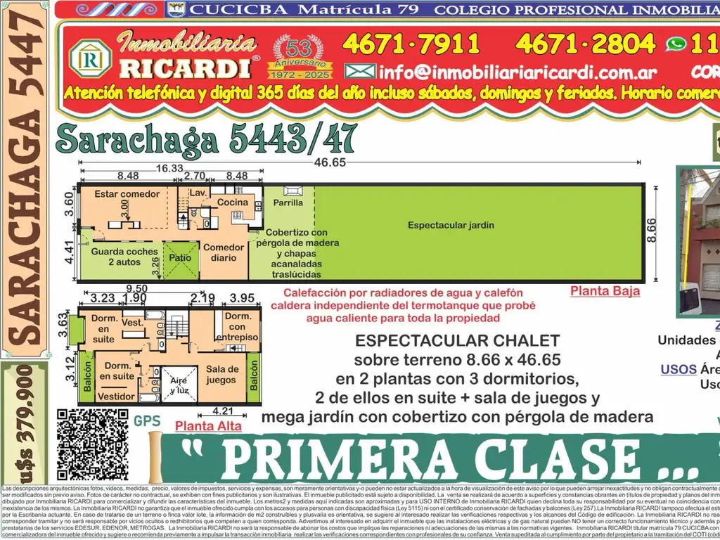 La Inmobiliaria RICARDI NO garantiza que el inmueble cumpla con el certificado de conservación de fachadas y balcones (Ley 257) tampoco efectúa el estudio de títulos, ni analiza los alcances del Código de edificación y no será responsable por los vicios ocultos o redhibitorios que competen a quien corresponda. Advertimos al adquirente que las instalaciones eléctricas, de gas natural y-o sanitarias pueden NO solo no tener un correcto y adecuado funcionamiento técnico sino que además puede NO cumplir con las exigencias actuales de METROGAS- EDESUR- EDENOR - siendo a cargo del adquirente que implique su puesta en valor y-o funcionamiento.