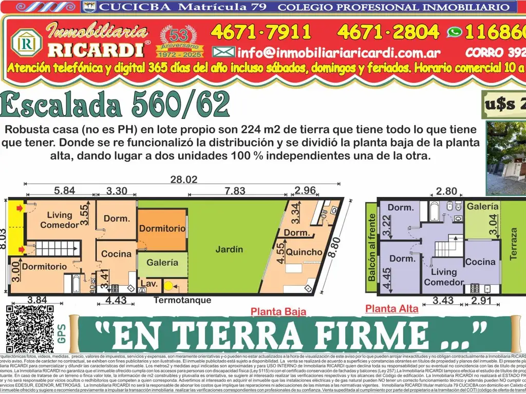 La casa que tiene nada mas y nada menos 8.00 metros de frente por 28 metros de largo reúne muy buena comodidad está bien distribuida y en su momento fue reformada a necesidad de su actual propietario donde se refuncionalizó la distribución y se dividió la planta baja de la planta alta, dando lugar a dos unidades 100 % independientes una de la otra, muy adecuado para familia numerosa o dos familias ensambladas incluso para dos familias de la misma familia donde hay independencia de plantas.