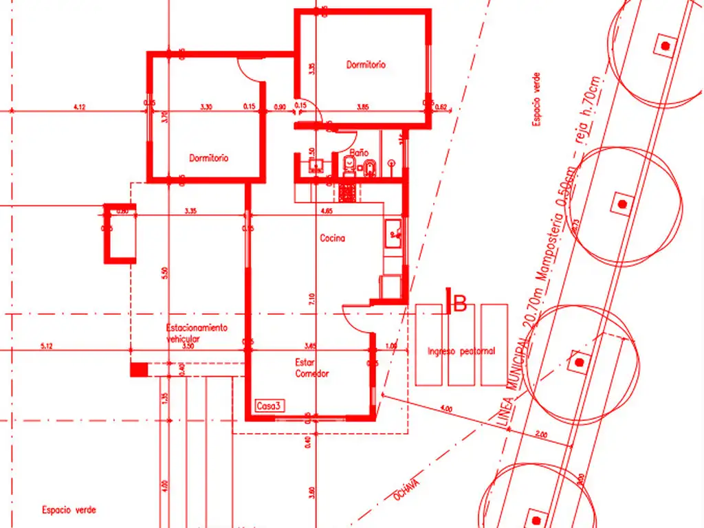 Cuenta con una superficie de 65 m² de vivienda y 21 m² de cochera, sobre un lote de 240 m² . La casa cuenta con dos dormitorios, un baño, con ante baño, living – cocina, con comedor integrados. Todos los servicios: luz, agua y gas en garrafa.
