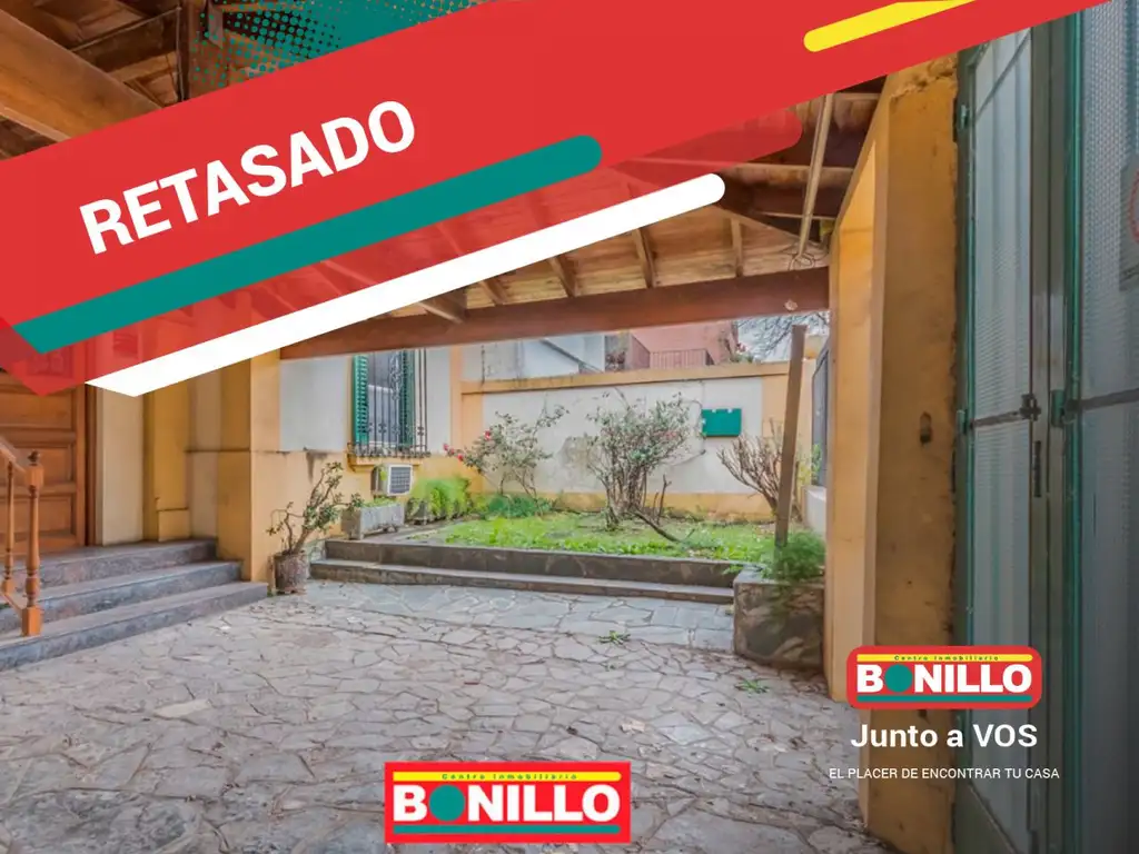 Casa 6 ambientes sobre lote de 8.70 x 22.30 en venta. Ideal para poner en valor. Ingresamos por un jardín de 4.55 x 3.20 contiguo a cochera semicubierta con techo de tejas.