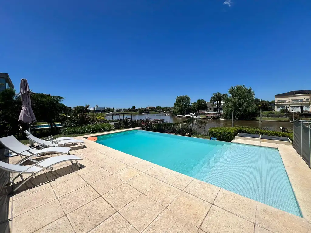 Piscina con borde infinito cercada, sector fogonero, hermoso jardín parquizado, muelle con bajada al río y amarra.