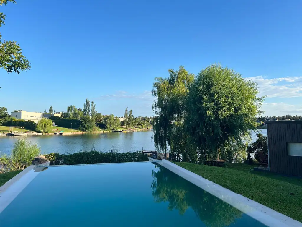 En el exterior galería con parrilla, espectacular jardín parquizado, árboles, grama abhiana, cerco vivo. La pileta con borde sin fin, deck de madera, solarium. Muelle, estacadas. Riego automático por aspersión. Posee un moderno container, que se puede utilizar como oficina, o dormitorio de húespedes.