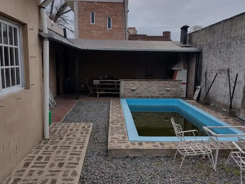 Entrada de vehículo con portón corredizo, pileta en su patio, con quincho de fondo y parrilla.