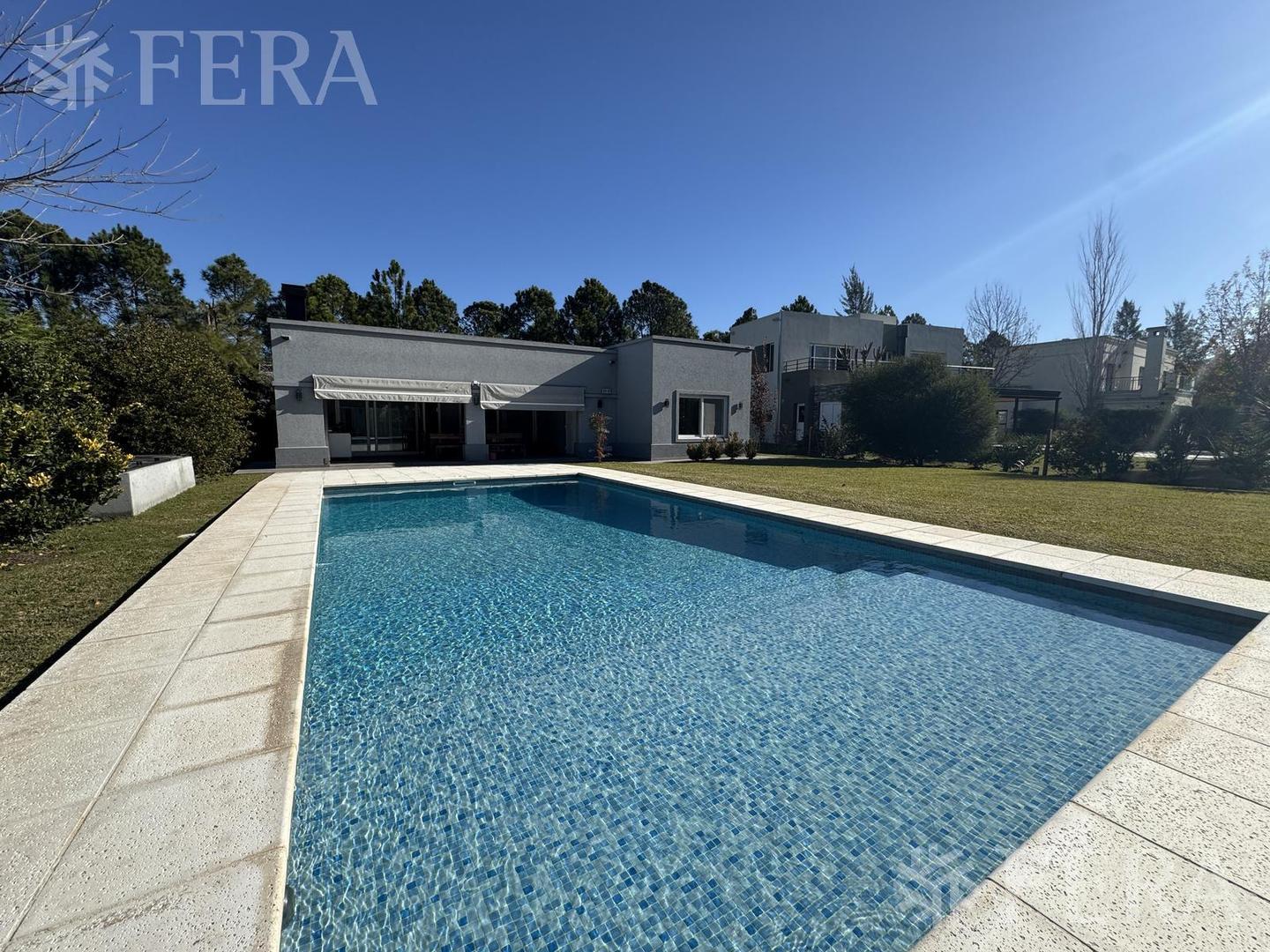 Impecable residencia a estrenar, desarrollada en una planta, sobre bellisimo lote totalmente forestado la propiedad se compone de un living comedor, muy amplio y luminoso, con cocina integrada con muebles sobre y bajo mesada, anafe, horno y campana. Amplio lugar para heladera y despensa. Lavadero con mesada y bacha,  caldera,  termotanque e instalaciones para colocacion de lavarropas. El area privada se compone de dos dormitorios con placards, baño compartido con antebaño. Mastersuite con vestidor , baño completo, torre de ducha y jacuzzi. Muy luminosa con hermosas vistas al jardin. En el exterior, galeria semicbierta con parrilla e isla cn bacha y lugar de guardado. Baño exterior y piscina. Muy buenos detalles en las terminaciones, tanto de aberturas como de pisos, iluminacion, aires acondicionado en todos los ambientes y cortinas ya instalada información adicional: tipo de techo: chapa tipo de piso: porcelanato tipo de vista: vista bosque tipo de pendiente: moderada aire acondicionado individual artefactos de cocina caldera calefacción desayunador espacio para vehículo extractor de aire gas natural muebles de cocina radiadores termotanque abl calefacción gas natural refrigeración rentas ambientes: fondo jardín galería garage pileta servicios: cloacas, gas otros servicios: aire acondicionado